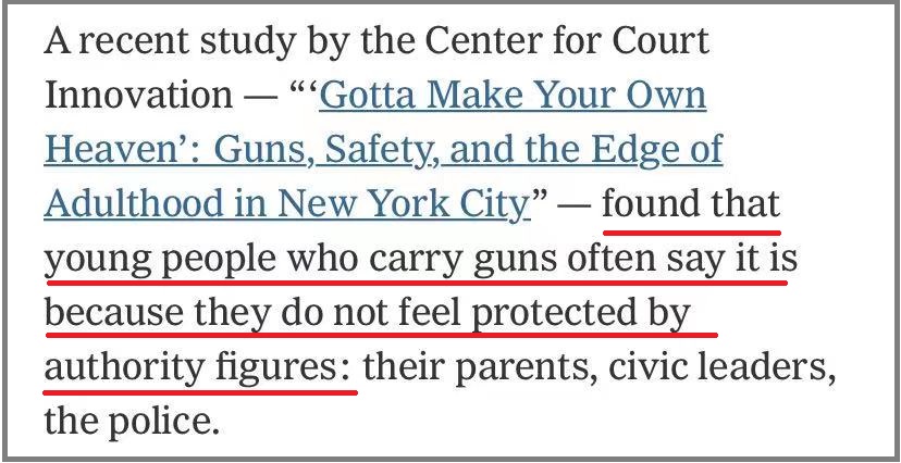 法院創新中心(Center for Court Innovation)最近的一項研究表明,攜帶槍支的年輕人普遍認為,他們感受不到來自權威人物的保護,比如他們的父母、公民領袖、警察。