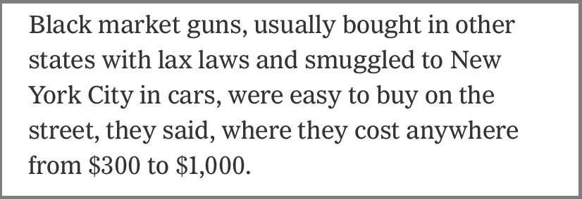 據報道,黑市通常在其他法律不嚴的州購買非法槍支,然後用汽車偷運到紐約市,街上很容易買到這種非法槍支,價格從300美元到1000美元不等。