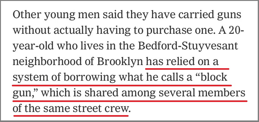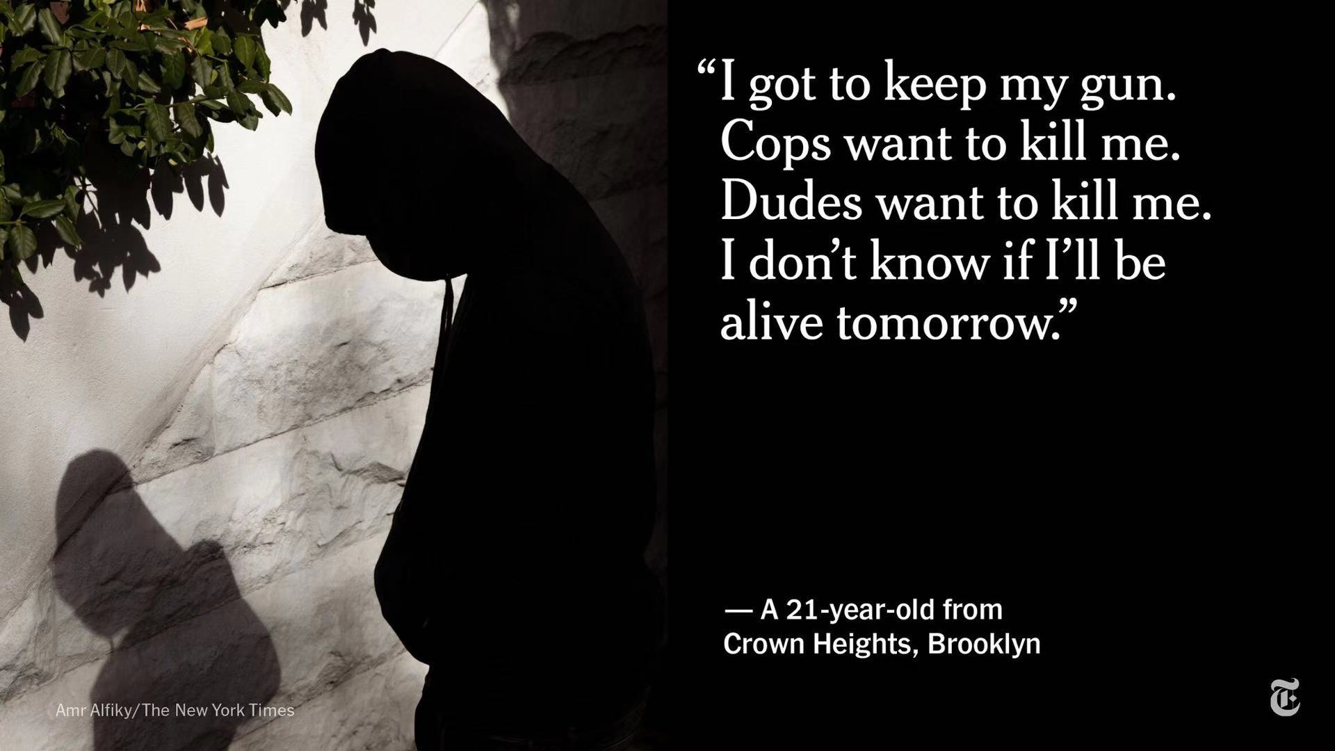 來自布魯克林另一個街區布朗斯維爾(Brownsville)的一名16歲男孩説,在他和朋友們開始受到另一夥人的威脅後,他買了自己的第一支槍——一支0.40口徑的史密斯威森手槍。“他們向我開槍,我必須帶一把槍”男孩説。