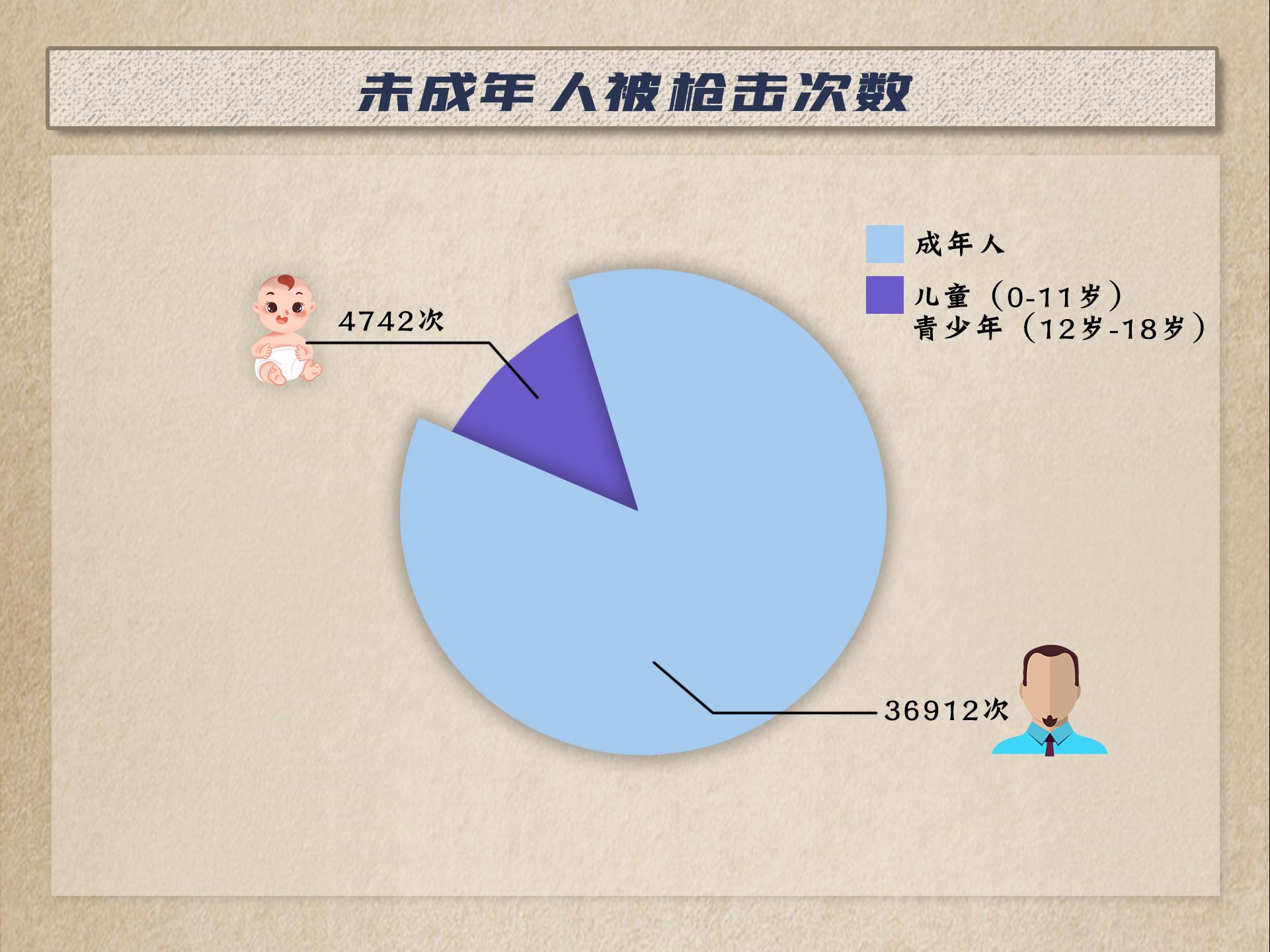 另一個數字更為觸目驚心,在這些槍擊暴力事件中,有超過4700名兒童及青少年(18歲以下)被射擊,約佔總數的12.8%。12月5日,阿拉巴馬州蒙哥馬利縣一名僅2歲的男孩就在一起槍擊案中身亡。