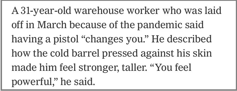 疫情導致的失業問題,也對社會穩定造成了威脅。一位31歲的倉庫工人在三月份因為疫情而被解僱,他説擁有一把手槍“改變了我”,他描述了手持冰冷的槍管是如何讓自己感覺更強壯、更高大。“這讓我覺得自己很強大。”他説。