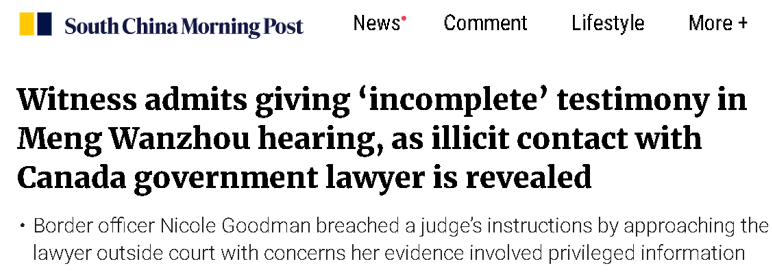 《南華早報》當天也以《證人承認在孟晚舟案聽證中提供不完整證言,以及違規與加拿大檢方律師接觸一事亦被公開》為標題及時報道了此事。