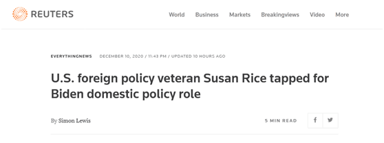 拜登10日宣佈選擇賴斯擔任其國內政策頂級顧問及國內政策委員會主任。對於選擇外交政策資深人士負責國內事務的決定,路透社稱,這“令人感到驚訝”。
