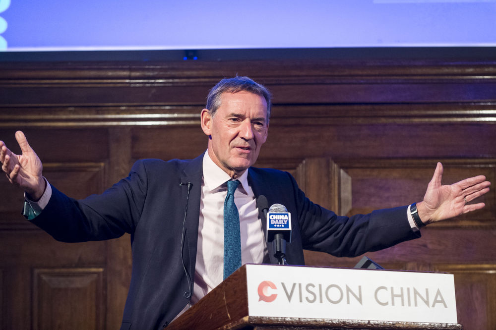 圖為2018年9月13日,“金磚國家”概念提出者、英國著名經濟學家吉姆·奧尼爾在“新時代大講堂”上發言。當日,中英兩國學者官員在倫敦出席“新時代大講堂”活動,盛讚中國改革開放四十年所取得的成就。(新華社發,史蒂芬·程攝)