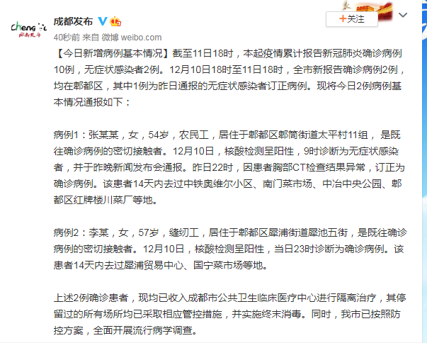 【今日新增病例基本情況】截至11日18時,本起疫情累計報告新冠肺炎確診病例10例,無症狀感染者2例。12月10日18時至11日18時,全市新報告確診病例2例,均在郫都區,其中1例為昨日通報的無症狀感染者訂正病例。現將今日2例病例基本情況通報如下: