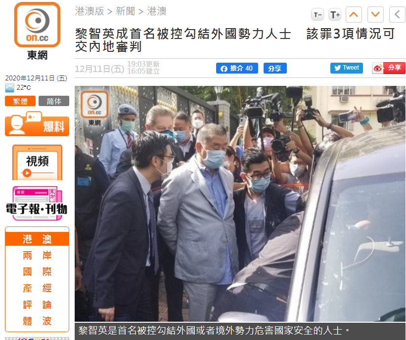 港媒分析:黎智英被加控勾結外國或者境外勢力危害國家安全罪,3種情況下可交內地審判
