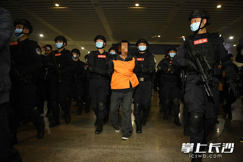 今日下午,身負6死2傷命案的A級通緝令逃犯張承禹被警方押解回長沙。(《長沙晚報》全媒體記者 黃啓晴 攝)