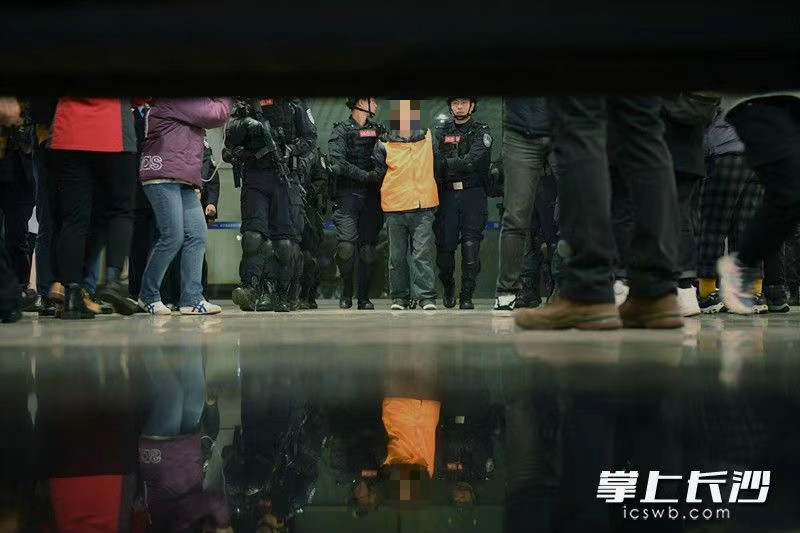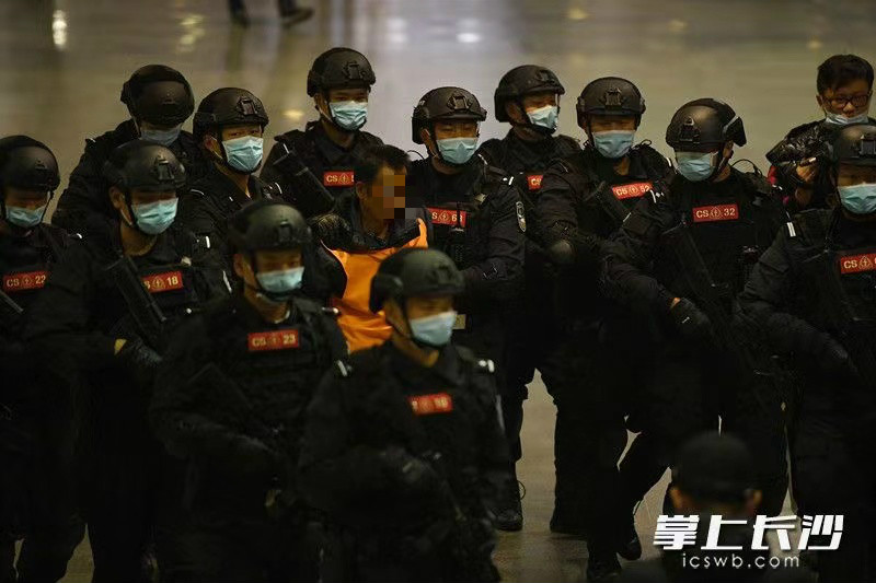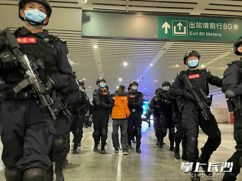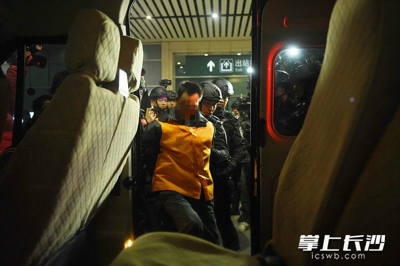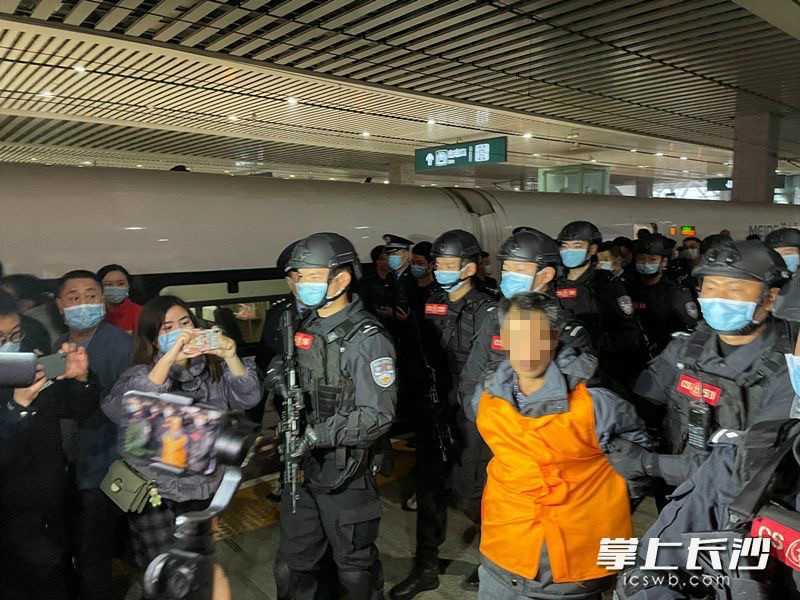 12月11日下午4時44分,長沙火車南站月台上警燈閃爍。隨着G2339次列車準點駛入,在江西南昌落網的公安部A級通緝令逃犯張承禹戴着腳鐐手銬,被長沙公安專案民警押下列車。隨即,荷槍實彈的特警隊員將其快速押上警車駛離。