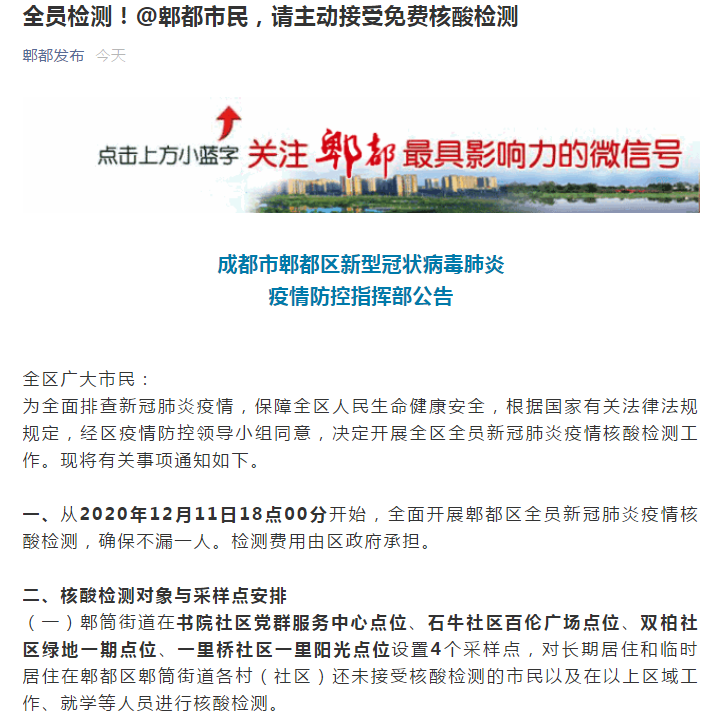一、從2020年12月11日18點00分開始,全面開展郫都區全員新冠肺炎疫情核酸檢測,確保不漏一人。檢測費用由區政府承擔。