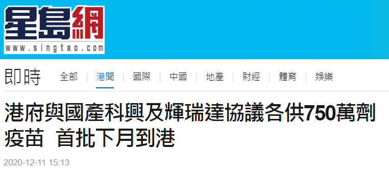 報道稱,林鄭月娥表示,特區政府對採購疫苗從來沒有掉以輕心,且非常嚴謹地去跟進疫苗採購工作,而採購疫苗的政策目標,是為全港市民能免費接種。訂購數量為香港人口的2倍。