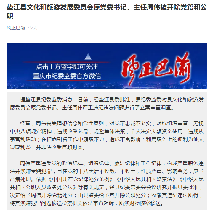 重慶墊江縣文化和旅遊發展委員會原黨委書記、主任周偉被開除黨籍和公職