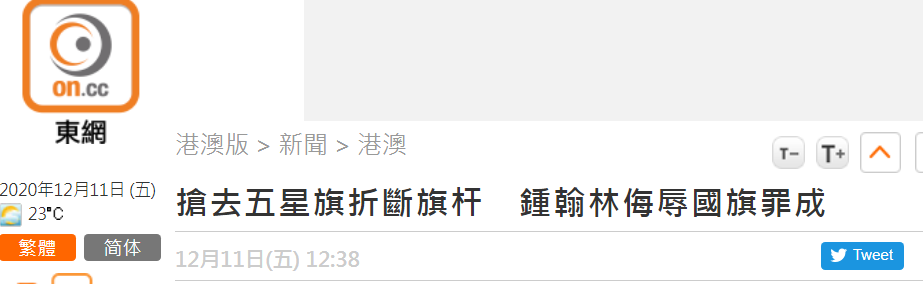 搶五星紅旗並折斷旗杆扔地上,亂港分子鐘翰林侮辱國旗罪成。