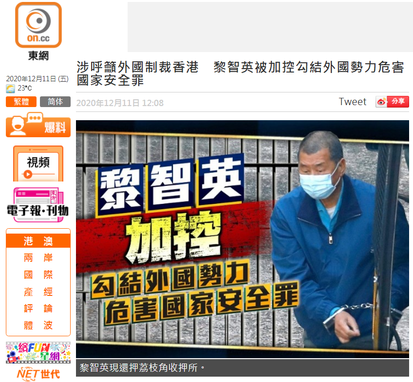 快訊!港媒消息:黎智英被加控勾結外國或者境外勢力危害國家安全罪