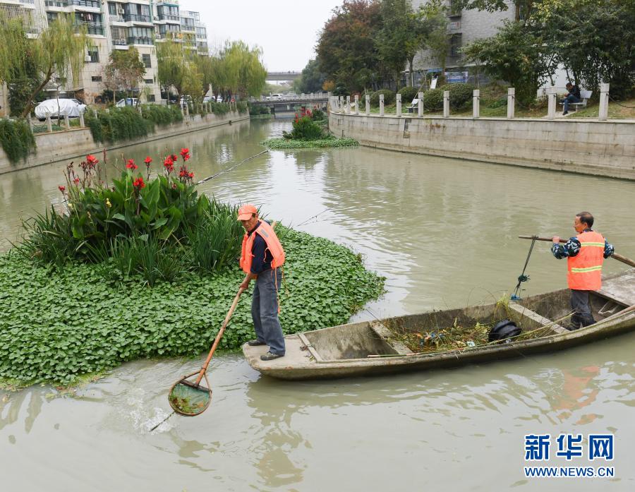 11月16日,工作人員在浙江湖州吳興區環渚街道藤橋港河道里清除雜物。新華社記者 翁忻暘 攝