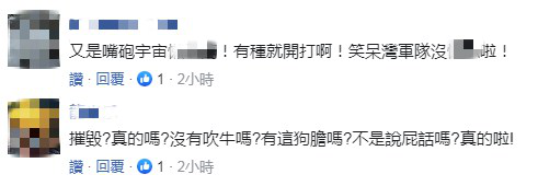 對於張哲平的説法,有島內網友表示,“又是嘴炮”,“有種就開打啊!”還有人説,“摧毀?真的嗎?沒有吹牛嗎?有這狗膽嗎?不是説屁話嗎?真的啦!” ↓