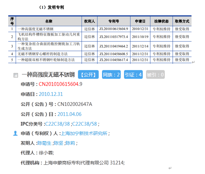 值得關注的是,根據招股書披露邁信林所擁有的專利中,申請日最早的一項為“一種高強度無磁不鏽鋼”,招股書披露為繼受取得。但是根據國家知識產權局公示的信息,此項專利目前的專利權人仍然是“上海加寧新技術研究所 ”,並無證據指向邁信林對此項專利擁有任何權利。