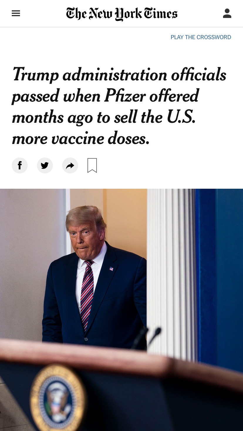 △《紐約時報》報道,輝瑞公司此前曾希望在美國市場留下更多疫苗,卻遭到特朗普政府拒絕