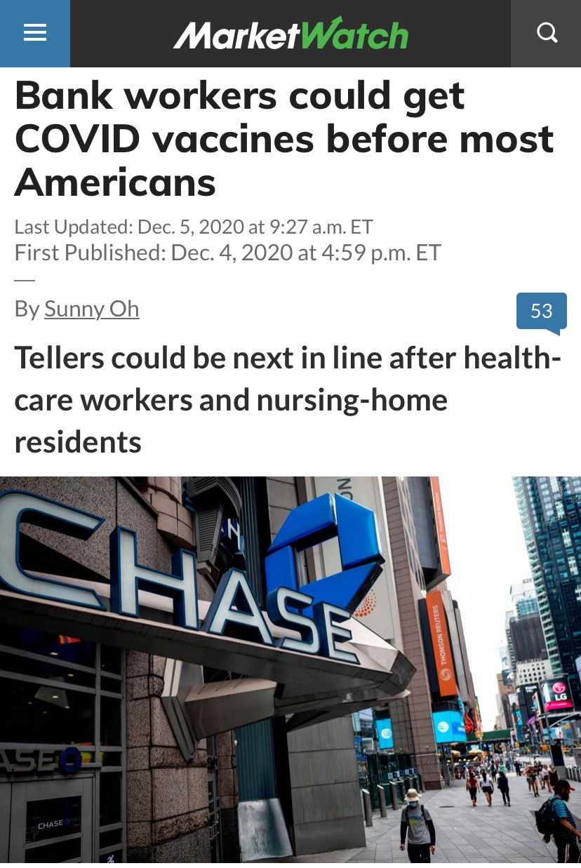 美國疾控中心的這一決定引起了輿論的廣泛批評。有專家表示,相比銀行業人士,教育工作者、高齡人士和有基礎疾病的患者更加需要新冠疫苗,銀行之所以能先拿到疫苗,完全是資本作祟,是“富人優先”的明證。