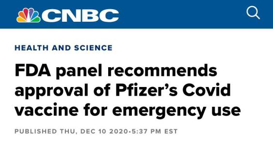 △美國消費者新聞與商業頻道(CNBC)報道,FDA疫苗諮詢委員會建議批准輝瑞疫苗的緊急使用授權申請