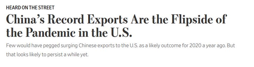 △《華爾街日報》:中國創紀錄的出口增速和美國疫情形成對照