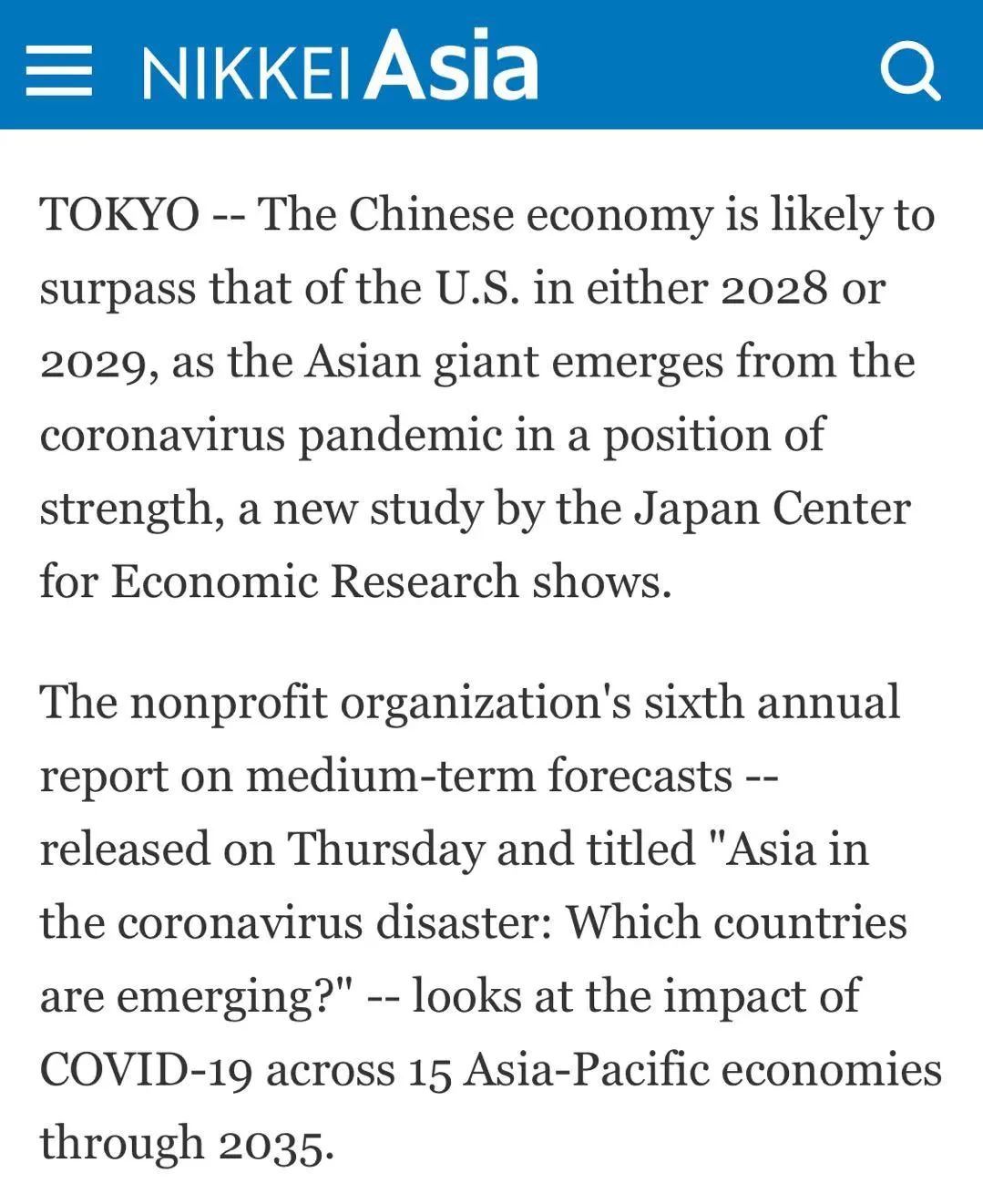 《日經亞洲評論》網站12月10日援引日本經濟研究中心(JCER)的最新研究結果説,中國這個亞洲巨人從新冠肺炎疫情中強勢崛起。
