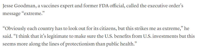 重點關注美國政治新聞的媒體“點名”( Roll Call)網站8日刊文指出,這不是特朗普第一次祭出“美國優先”的政策了,但該政策未必會有助於美國抗擊疫情。文章援引美國疫苗專家、前FDA官員的話表示,該行政命令傳達的信息太“極端”了,美國此舉更像是貿易保護主義,而非從公共健康角度出發。