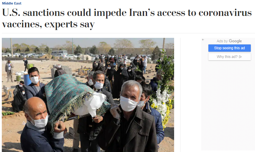隨着來自不同製藥公司的多款疫苗研發成形,“明年接種”成了全球深受疫情肆虐之苦的人們翹首期盼的頭等大事。然而,有分析指出,“疫苗霸權 ”的作祟讓事情並不像憧憬中的那麼樂觀,很多國家可能會陷入“沒錢買”或者“有錢也買不到”的困頓中。在這方面,飽受美國製裁之苦的伊朗首當其衝。