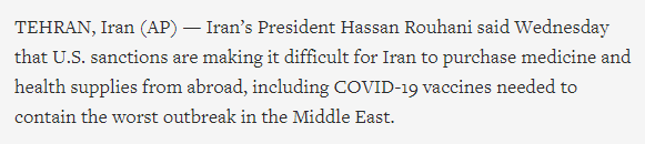 魯哈尼 :“伊朗人民應該清楚,無論我們想做什麼,進口藥品也好,進口醫療器械或疫苗也好,特朗普政府都給我們製造了太多的麻煩。本來很簡單的一件事,打個電話,發條信息,很快就能完成的交易,我們都得花上幾周或幾個月,全國齊心協力地把錢從一個地方轉到另一個地方,就為了買藥。白宮那夥人的邪惡任期已經沒剩幾天了,卻依然充滿惡意。”