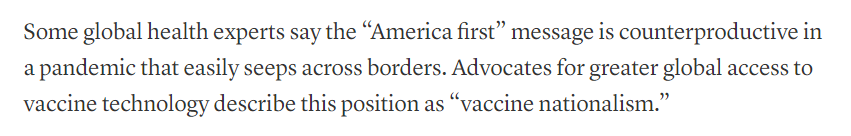 此外,文章還援引全球衞生專家的話表示,“美國優先”的信息在一場容易跨越國界的疾病大流行中起到了反作用。倡導在全球範圍內獲得更多疫苗技術的人士將這種立場描述為“疫苗民族主義”。