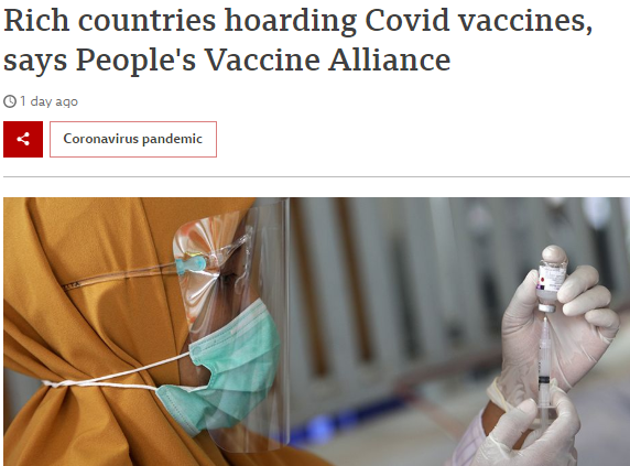 英國廣播公司(BBC)引用數據稱,即使富裕國家的人口約佔世界總人口的14% ,但他們已擁有或將擁有的新冠肺炎疫苗數量卻佔了全球的一半以上。