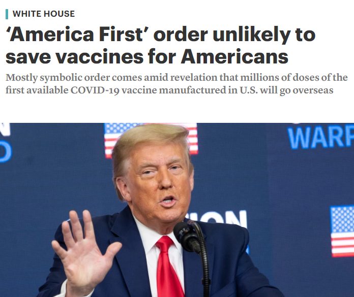 在這些囤積疫苗的發達國家中,美國又成了最引人注目的“榜樣”。美國總統特朗普8日簽署了*“讓美國人優先獲得疫苗”的行政令* ,並稱“這項行政令將確保美國政府在將疫苗送往其他國家之前,優先將疫苗發放給美國公民,然後我們將與全球其他國家進行合作”。