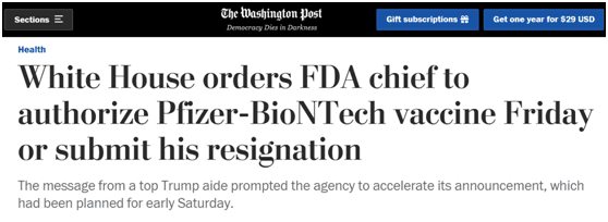 外媒:白宮要求FDA局長當地時間11日批准新冠疫苗,否則就讓其辭職