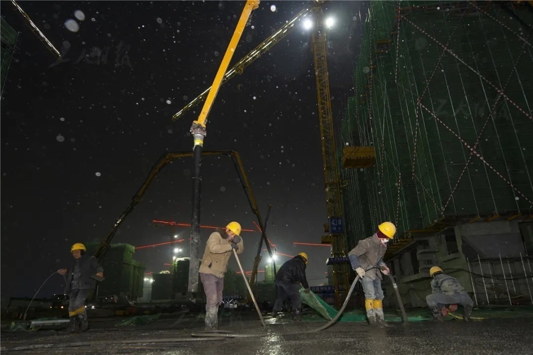 12月1日23時,雄安新區夜間降雪,在中鐵建工集團承建的容東片區E組團安置房項目上,混凝土澆築作業照常進行。