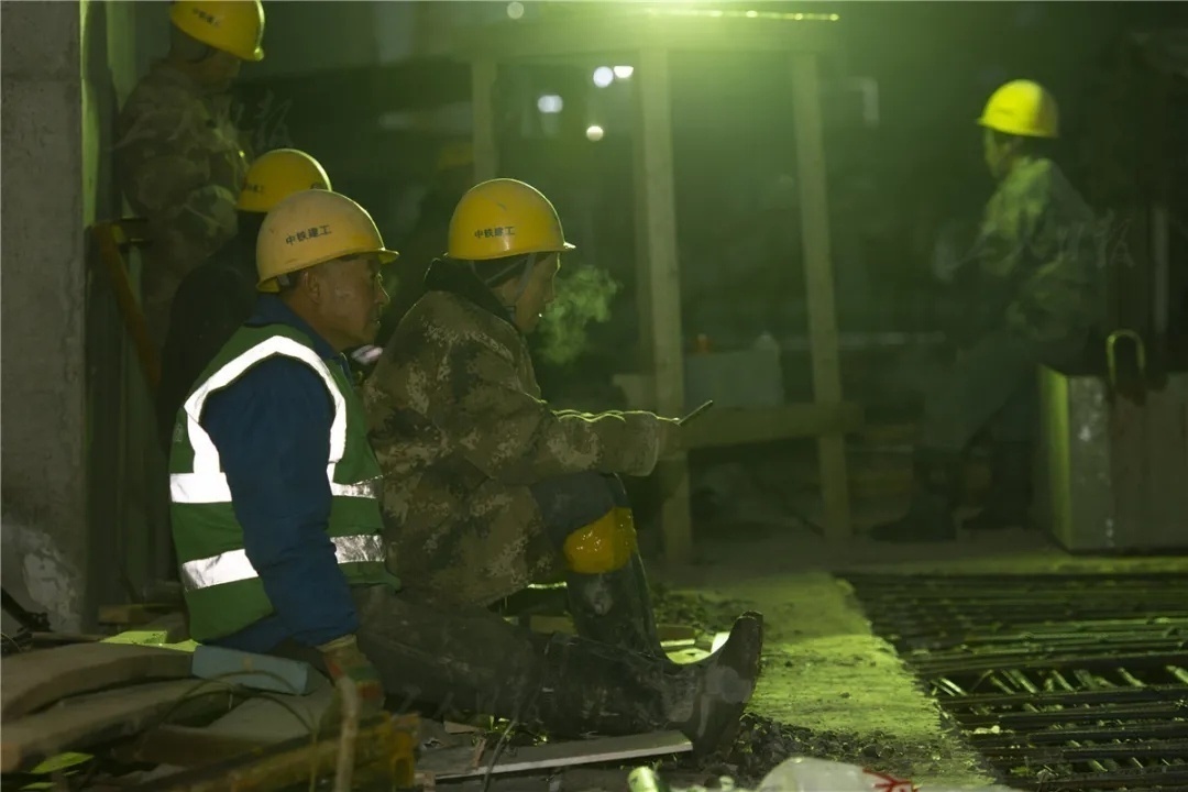 12月2日凌晨,幾位混凝土工在工作間隙靠牆休息。