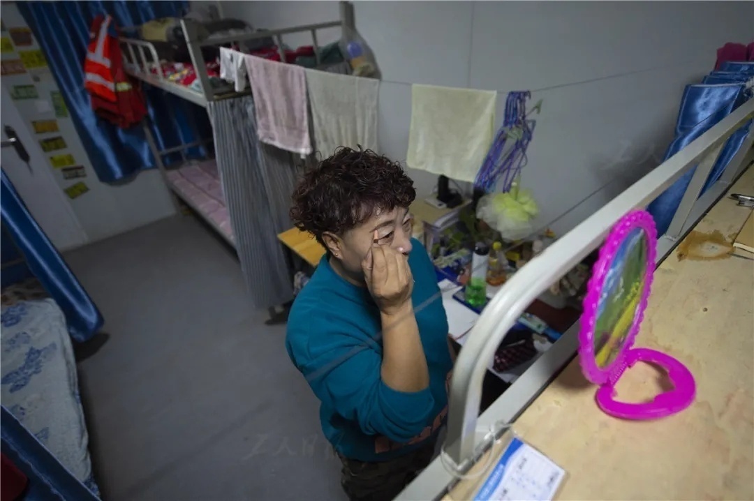 12月4日上午,容東片區E2組團安置房項目的塔吊隊長王鳳敏在上崗前梳妝打扮。她管理的塔吊隊共有60多位塔吊司機,其中女性僅兩位。