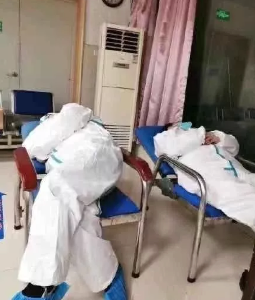 疫情初期,蜷縮在地上、椅子上入睡,是一線醫護人員的“標配”。