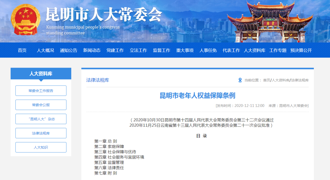 12月11日,春城晚報-開屏新聞記者從昆明市人大常委會召開的新聞發佈會上獲悉,《昆明市老年人權益保障條例》將於2021年1月1日起施行。