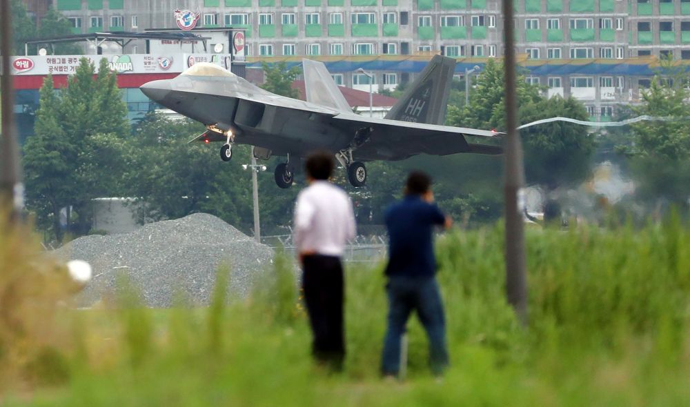 2018年5月16日,一架美軍F-22“猛禽”戰鬥機在韓國光州空軍基地降落。(新華社/法新)
