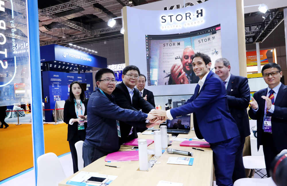 11月6日,在上海舉行的第三屆中國國際進口博覽會上,中國和瑞士企業代表簽訂協議後握手互致祝賀。(新華社記者方喆攝)