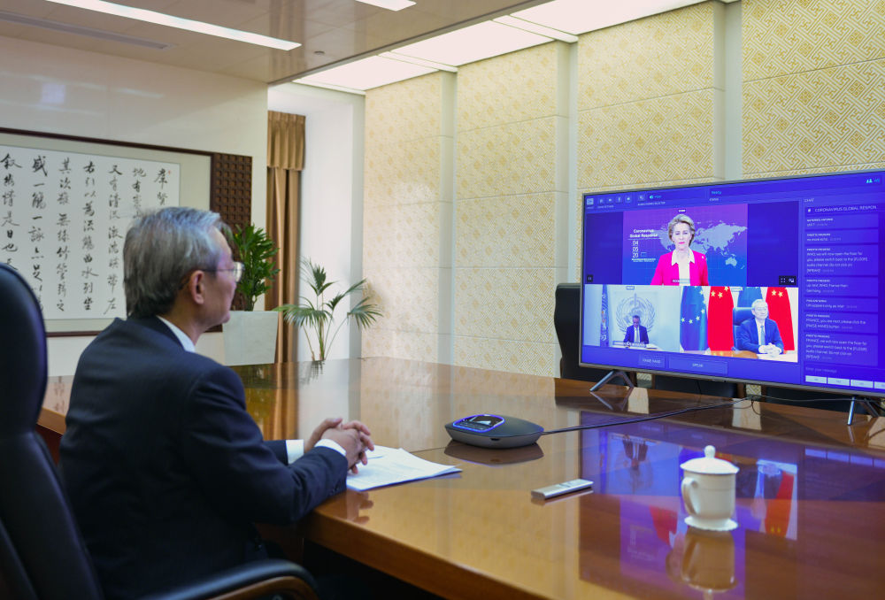5月4日,在比利時布魯塞爾,中國駐歐盟使團團長張明作為中國政府代表,出席應對新冠肺炎疫情國際認捐大會視頻會議並致辭。(新華社發)