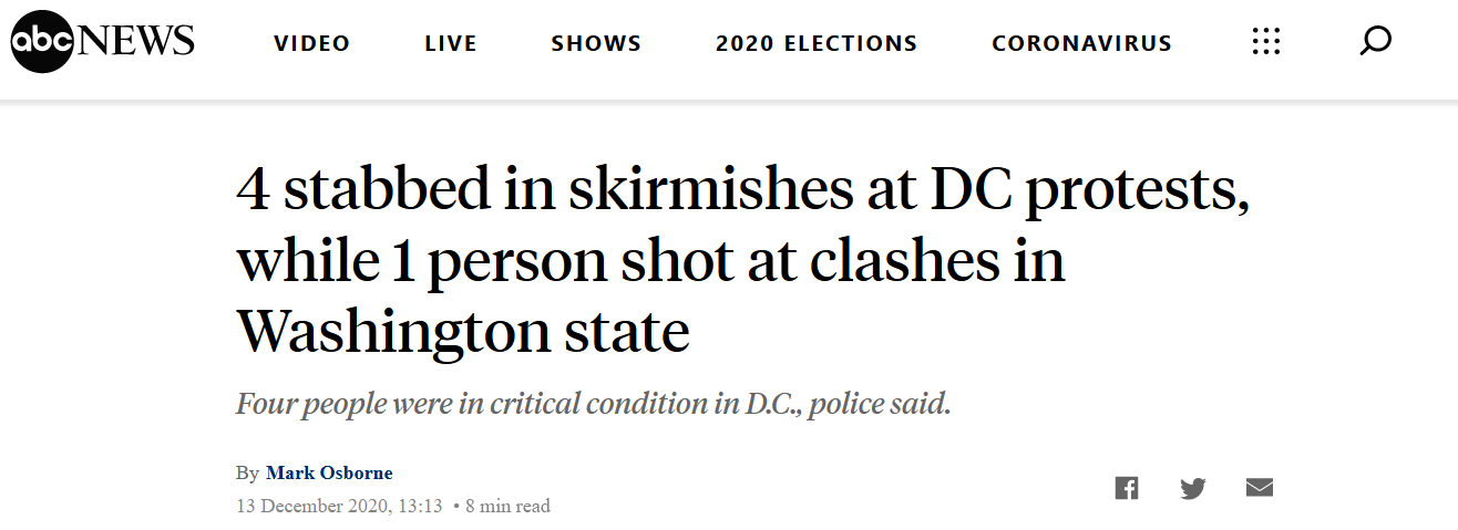 另據美國廣播公司(ABC)消息稱,在12日華盛頓的抗議活動,特朗普支持者與反對者起爭執,目前已致4人被刺傷,1人中槍。
