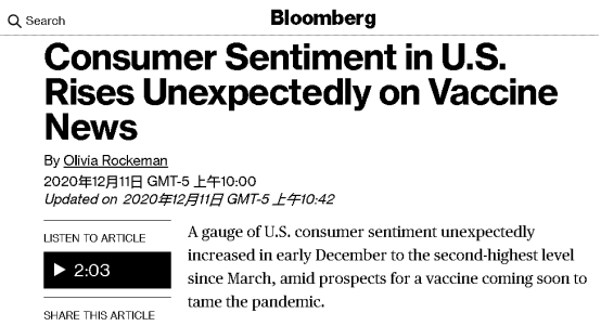△彭博社報道,美國消費者信心受疫苗消息影響意外回升