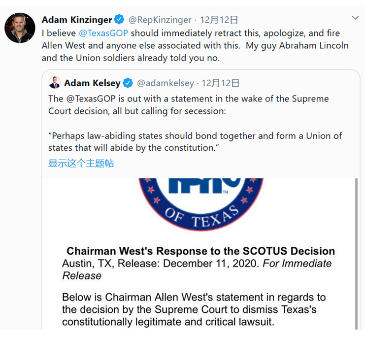 代表伊利諾伊州第16區的共和黨眾議員亞當·金津格(Adam Kinzinger)發推譴責稱,得克薩斯共和黨“應立即撤回,道歉,並開除艾倫·韋斯特和與此有關的任何人。”↓