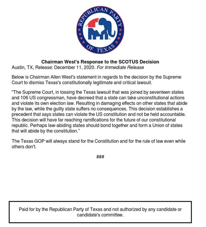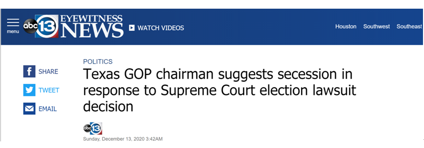 【環球網報道 記者 趙建東】“得克薩斯州共和黨主席建議脱離(聯邦),以回應最高法院有關選舉的訴訟裁決”,美國ABC電視台13頻道13日以此為題報道稱,在美國最高法院駁回得克薩斯州政府要求認定四個搖擺州選舉結果違憲的訴訟後,該州共和黨主席艾倫·韋斯特(Allen West)11日晚發表聲明稱,“離開美國”可能是一個合適的回應。