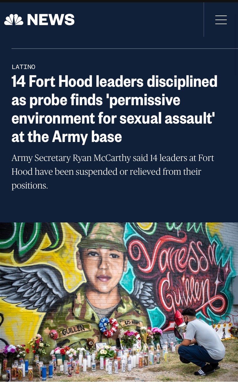 △美國廣播公司報道,14名胡德堡陸軍基地官員因長期縱容性侵和性騷擾行為而被處分