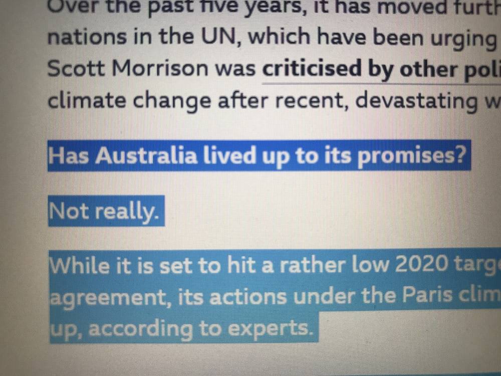 英國廣播公司的報道認為,澳大利亞並未遵守巴黎協定的承諾,其應對氣候變化的表現可以直接説是不合格。