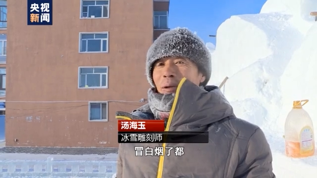 冰雪雕刻師 湯海玉: 今天感覺是天氣最冷的一天,冒白煙了都,穿了兩個羽絨服,自己家做的棉褲,3斤的棉褲,戴的棉手捂子,幹起活兒來還可以。