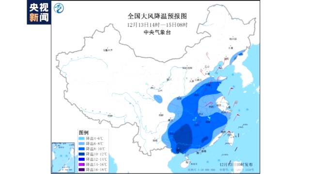 中央氣象台繼續發佈寒潮藍色預警。預計今明兩天,從東北、西北、華北、黃淮到江淮、江漢、江南、西南地區東部、華南等地的大部地區都將降温6~8℃,其中,湖南西南部、貴州東南部、廣西大部、廣東北部等地部分地區降温可達10℃。北方有4~6級偏北風、陣風7~8級,南方有4~5級偏北風,江河湖面陣風可達6~7級。
