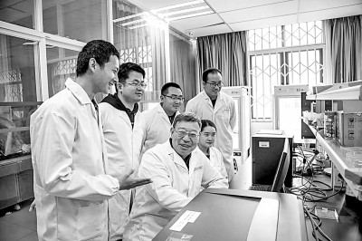 周青平教授(左四)在與團隊成員討論問題。資料圖片