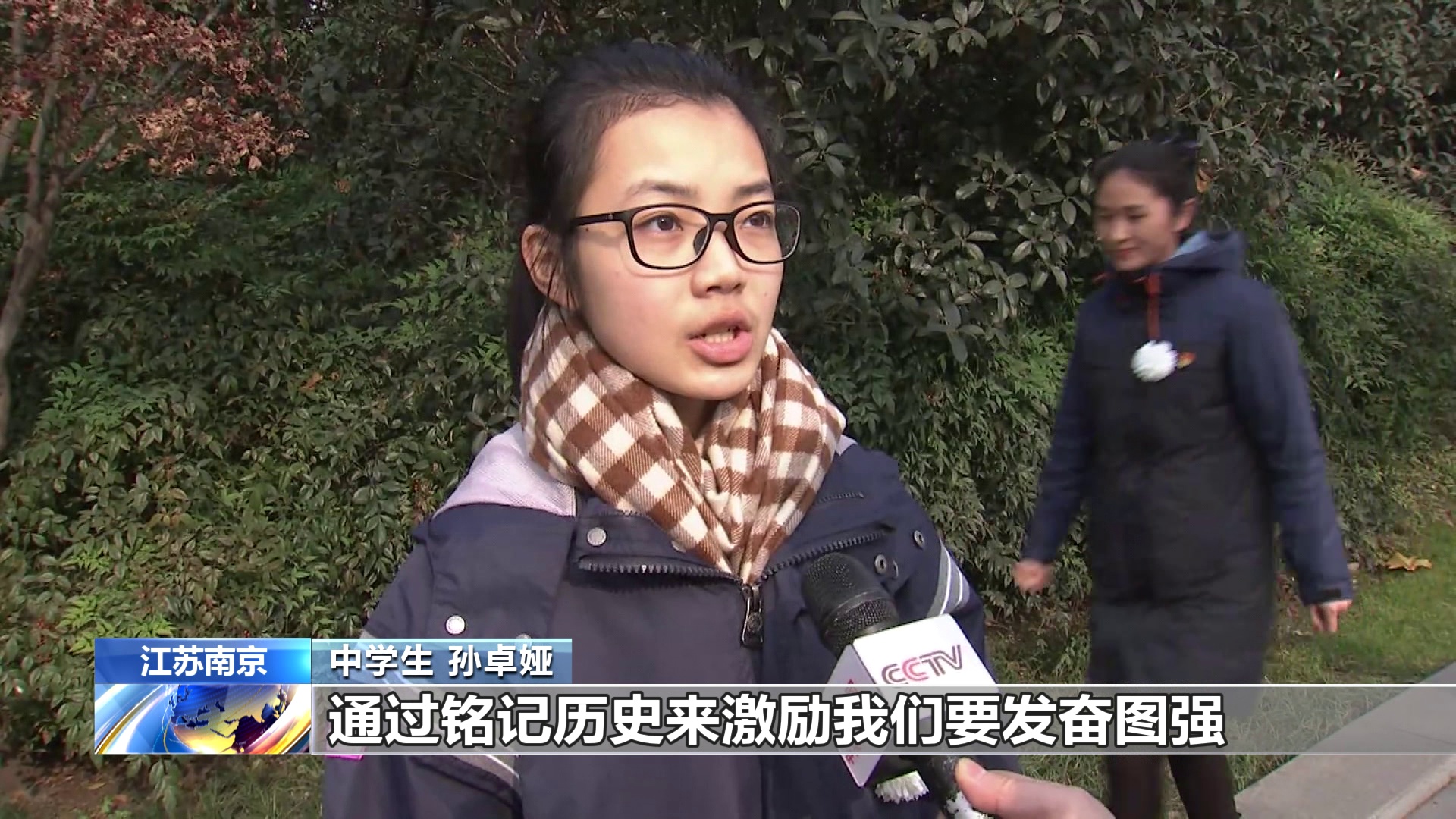 南京中學生 孫卓婭:勿忘國恥,和平生活的來之不易,通過銘記歷史來激勵我們要發奮圖強,努力學習,展望更加和平美好的未來。